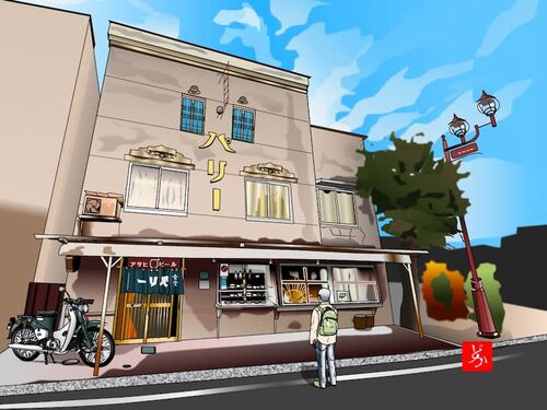 マウスで描いたエクセル画。 埼玉レトロシティ秩父に鎮座する昭和モダン飲食店「パリー食堂」。 建物は昭和2年築のモダンレトロオーラを放つ。付け合わせのフルーツのほうが立派なオムライスが秀逸だ。パーツ数1266。